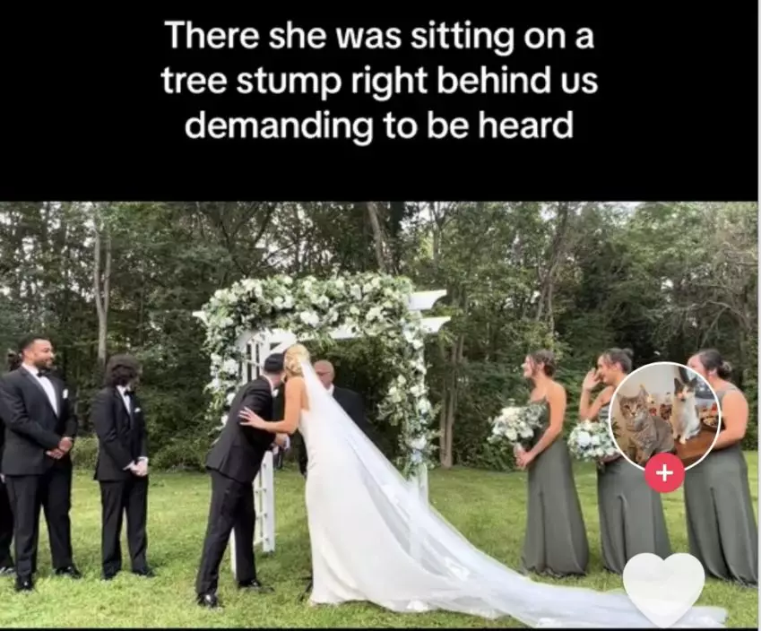 卡拉分享道,當時她和丈夫並不清楚為何賓客會突然發笑,初時還感到些許惱怒。然而當她轉頭向伴娘詢問後,才得知笑聲的源頭竟是因為一隻灰色的小貓在不停叫喚,「小貓就在我們身後的樹樁上,拼命喵喵叫想要吸引大家的注意」。
