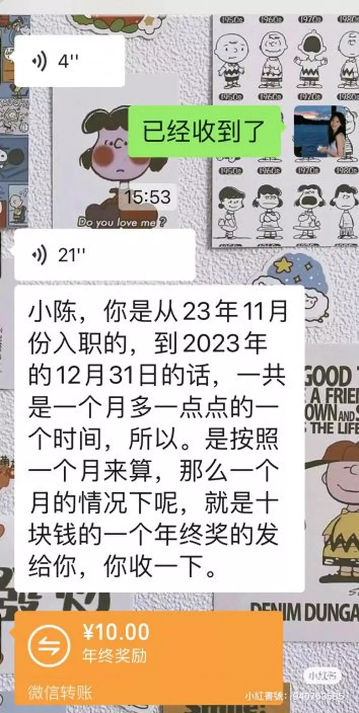 然而計算完後,帖主發現這一個月實際領到的年終獎僅有10元(人民幣,下同,約11塊港幣),這讓她相當傻眼,而老闆還一本正經地表示,「十塊錢的一個年終獎發給你,你收一下」。這一微薄獎金讓帖主忍不住自嘲道:「好消息:我也有年終獎;壞消息:10塊人民幣(約11元港幣)。」。