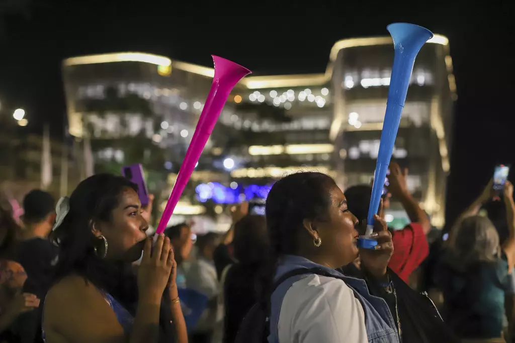 布克爾的支持者在薩爾瓦多市中心的赫拉爾多·巴里奧斯廣場慶祝大選結果。(AP圖片)
