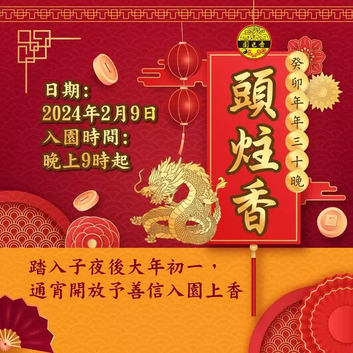 嗇色園黃大仙祠早前公布「頭炷香」安排,年三十、即2月9日晚上9時開放予善信入祠,善信可於「參神平台」等候,在子時、即晚上11時,或者午夜12時上「頭炷香」,而黃大仙祠亦會通宵開放至年初一晚上9時,並在年初一(10日)至十六(25日)期間延長開放時間,及實施人流管制。
