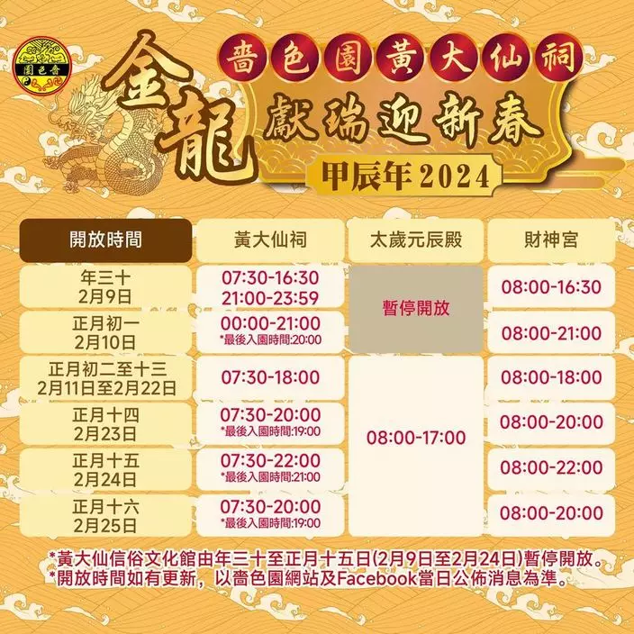年初一至十六(2月10日至25日),黃大仙祠會繼續實施人流管制及單向參神路線。善信需於祠外廟宇廣場及黃大仙廣場排隊入園,正門入口處則分為「往大殿」及「往太歲元辰殿」兩條隊伍。