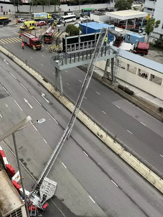 九龍灣消防局下午發生罕見雲梯倒塌事故,長約56米的雲梯塌下,橫亘兩條行車線,幸未擊中車輛,也沒人受傷。