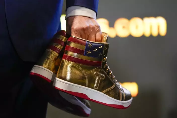 這款金光閃閃的高幫球鞋,靠近鞋口處印有美國國旗的圖案,側面還有代表著品牌的字母「T」標識。AP圖片