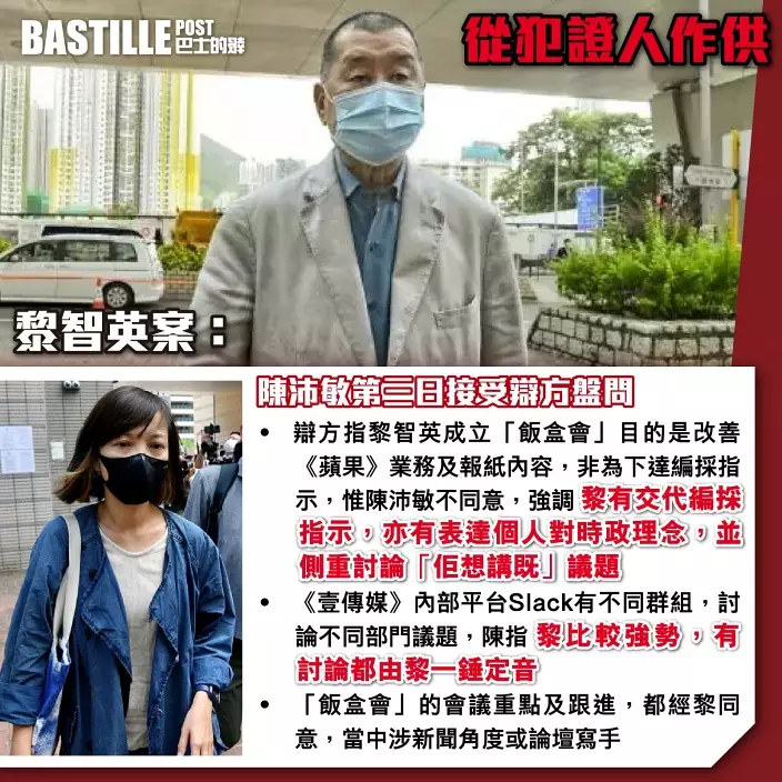 辯方續問,黎設立「飯盒會」以收集員工意見,陳指黎設立飯盒會,是想講多一些理念,「包括做生意嘅理念、對於時政嘅理念」。辯方指,黎亦關注《蘋果》業務及報紙內容,陳稱「可以咁講」,亦同意曾應黎的要求,草擬一份給同事的問卷。