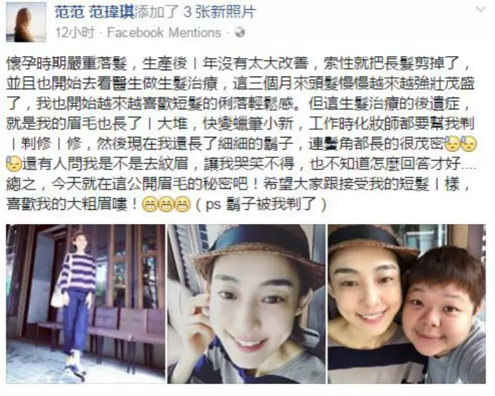 范范與老公黑人結婚五年,孖仔也已一歲了,溫馨的四口之家真是羨煞旁人。但是在懷孕期間范范受了不少苦,不僅嚴重孕吐,還引發了嚴重脫髮,出門只能戴假髮用帽子遮掩。生產後一年情況都沒有改善,於是開始進行生髪治療。近日范范在facebook上貼相,說道:「這生髪治療的後遺症,就是我眉毛也漲了一大堆,快變蠟筆小新了,化妝師都要幫我修一修。」