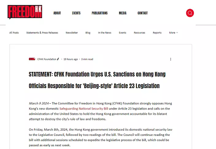 特區政府強烈譴責香港自由委員會基金會公然要求美國對中央和特區官員,特別是參與《基本法》23條立法的官員,實施所謂「制裁」,並誣衊抹黑《維護國家安全條例草案》。