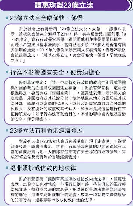 至於有人擔心23條立法完成後香港會出現「走資潮」,影響經濟發展,譚惠珠表示,世界上有戰爭或內亂的地方都很難有正常的商業經貿活動。香港如果不穩定便沒有發展前途,更不會有人願意來投資。保衛國家安全是世界上任何一個國家公民的應盡責任,因此完成23條立法越快越好,立法會按程序加速審議絕對符合香港市民的共識。