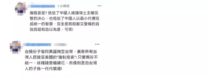 相關消息在島內傳開後,台當局立即表達「感謝」,島內網友則不以為然,有人在台媒評論區留言表示,「嚇阻什麽?低估了中國人維護領土主權完整的决心,也低估了中國人以最小代價完成統一的智慧,完全是既粗鄙又蠻橫的自說自話和自以為是,可笑!」該網友還認為,「台獨分子同美國掏空台灣、裹挾所有台灣人民接受美國的『强制投資』!只要兩岸不統一,這種錢會繼續花,而債則是由台灣人的子孫一代代償還!」
