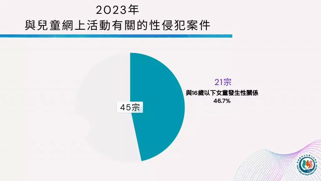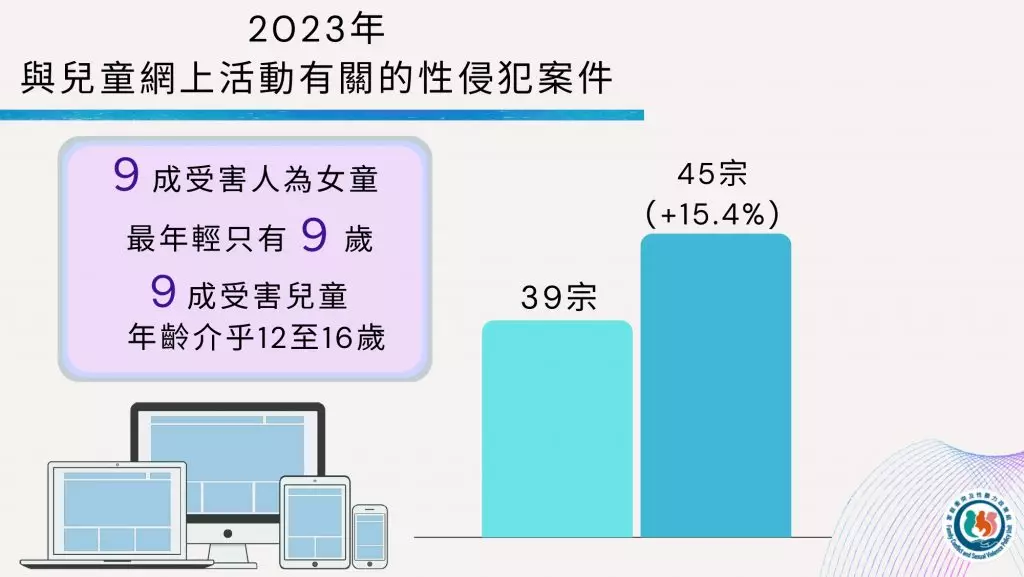 警方亦留意到,製作、管有或發布兒童色情物品情況愈加普遍。就與兒童網上活動有關的兒童色情物品案,在2023年警方一共錄得44宗,有7成受害兒童年齡介乎12至16歲,最年輕受害人只有9歲。至於與兒童網上活動有關的性侵犯案件中,9成受害人為女童,最年輕只有9歲。