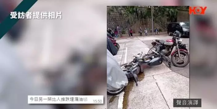 有電單車被人推倒至漏油,網民表示如有人亂掉煙頭就會成行著火,非常危險。(《一線搜查》影片截圖)