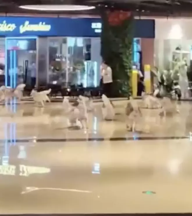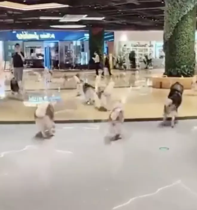 影片中可見,沒有了圍欄的約束,牠們跑到寬闊的商場裡就猶如脫韁的野馬,牠們還拉幫結派分批在商場一邊開心地繞場奔跑,一邊不斷嚎叫,加上這足足有上百隻哈士奇都集體越獄,令畫面更加壯觀。有部分淘氣的哈士奇竟忍不住搶奪商家和客人的食物,場面一度十分混亂,所幸這些哈士奇最終都被「捉拿歸案」,這一齣鬧劇才平安落幕。