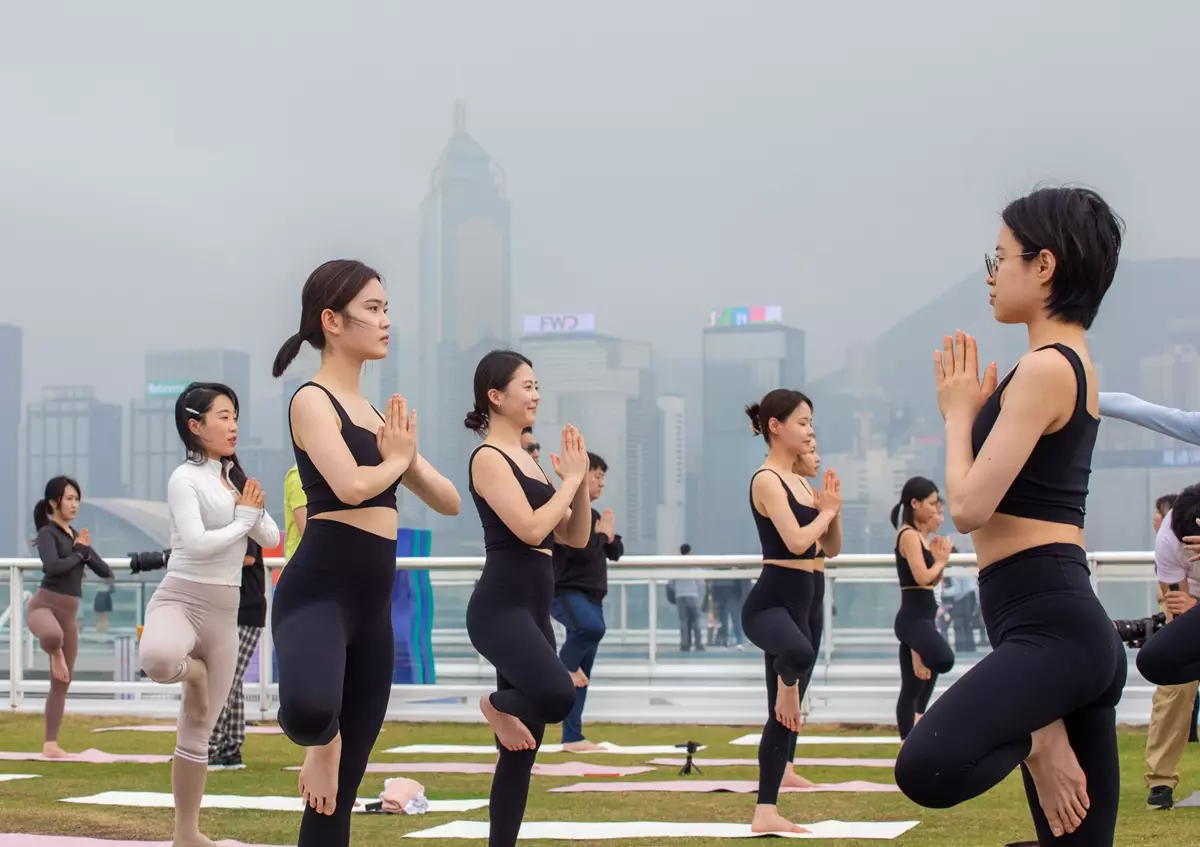 參加者完成瑜伽課後,在維港景色前合照留念。