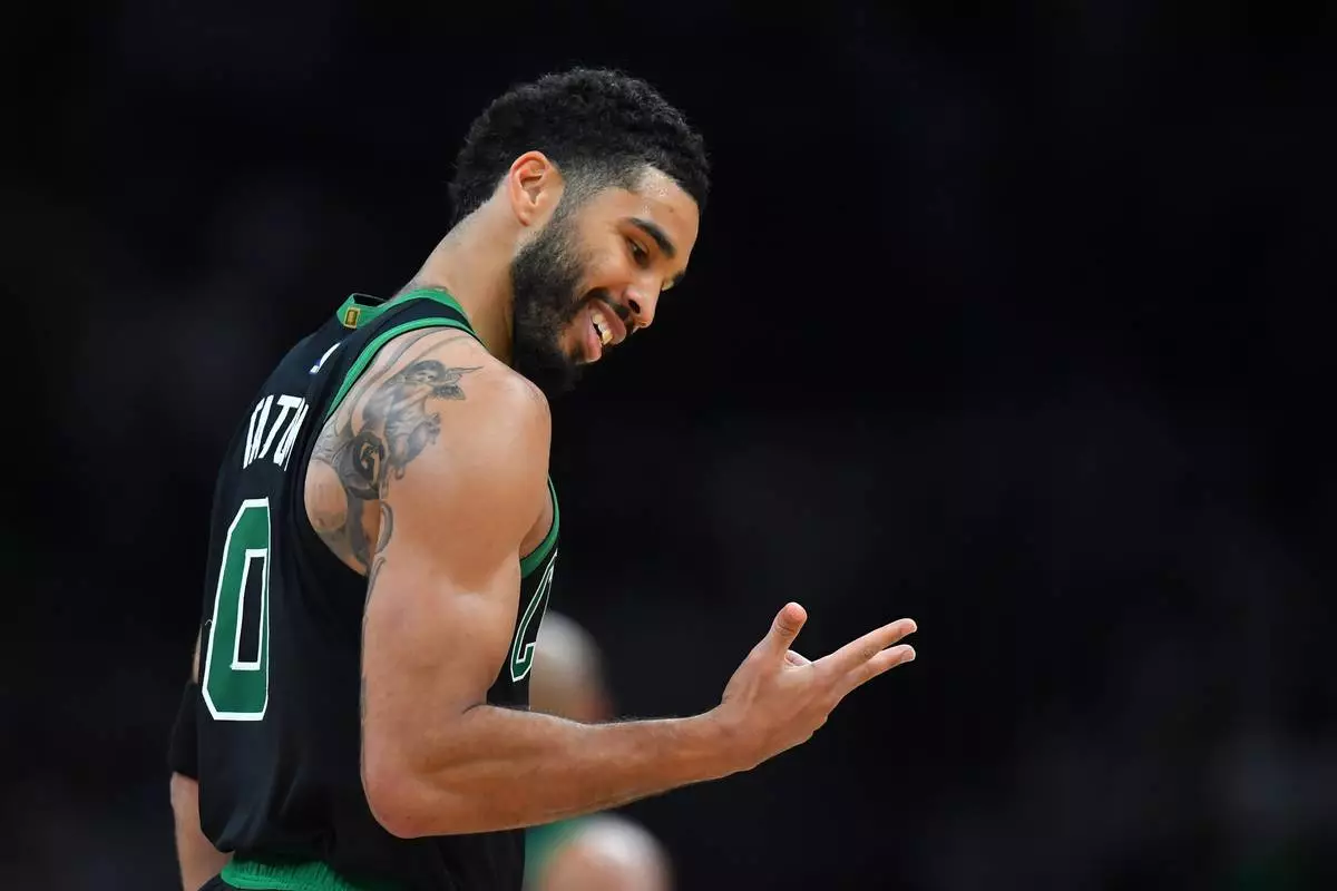 2026年4月5日周日,波士頓塞爾特人隊(Boston Celtics)前鋒謝臣泰譚(Jayson Tatum)在波士頓對陣多倫多速龍隊(Toronto Raptors)的NBA籃球比賽上半場得分後慶祝。(美聯社圖片/Steven Senne) AP圖片