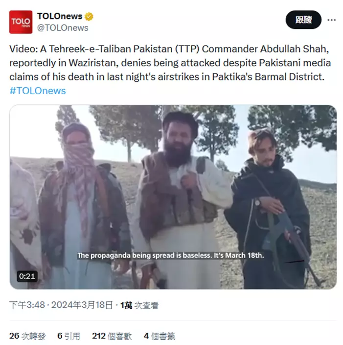 巴方聲稱空襲的目標、巴塔組織指揮官阿卜杜拉•沙阿拍攝了一段視頻,以證明自己沒被襲擊。X截圖