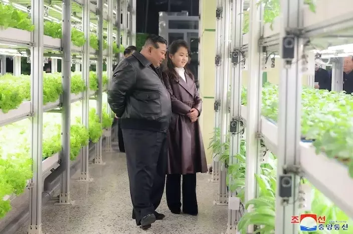 朝中社16日報道,北韓國務委員會委員長金正恩15日攜女兒出席江東綜合溫室竣工投產儀式。報道提到金正恩和女兒以及北韓其他黨政軍領導幹部一同參觀江東綜合溫室時,用了「偉大的嚮導者們和黨政軍領導幹部一起參觀了江東綜合溫室」的表述。