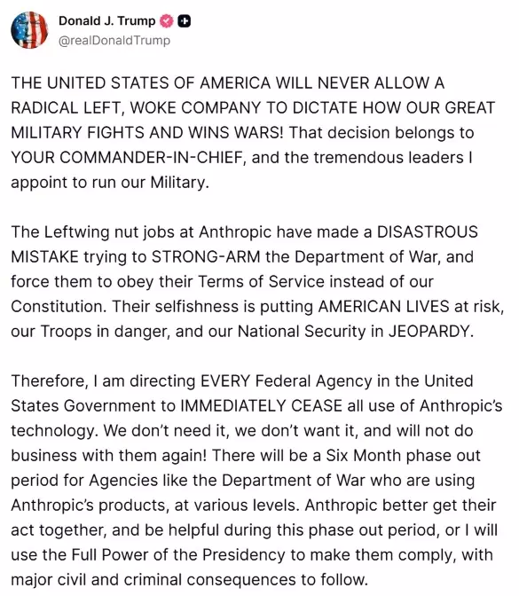 特朗普在社交平台真相社交發帖文表示:「我已指示美國政府所有聯邦機構立即停止使用Anthropic的所有技術。我們不需要它,我們不想要它,以後也不會再與他們做生意!」特朗普更對Anthropic嚴厲批評,形容該公司是「由一群對真實世界一無所知的人,所經營的失控、激進左派AI公司。