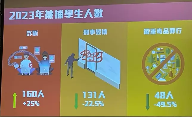 她說,2023年被捕學生中,160人涉詐騙,較上年同期升25%,刑事毁壞131人,較上年同期減22.5%,嚴重毒品罪行48人,按年減49.5%。學生的犯案行為包括替詐騙犯收取詐騙款項、借出戶口予人洗錢等、刑事毁壞如替犯罪份子淋紅油等。