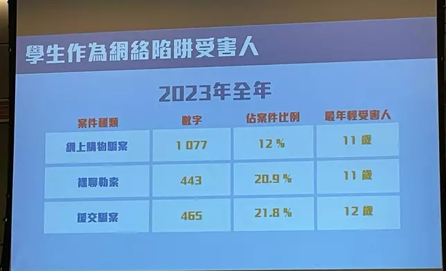 2023年度網絡罪案中,受害人為學生佔一成至兩成,其中涉裸聊及援交受害學生人數,2023年佔同類案件兩成,最年輕受害人分別為11歲和12歲。