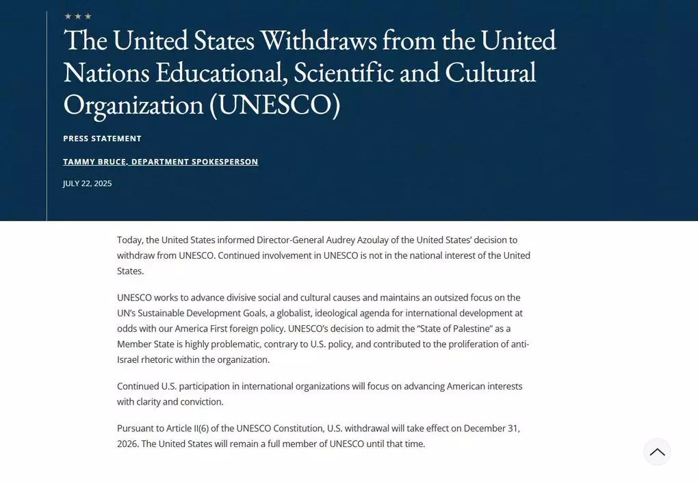 美國宣布退出聯合國教科文組織。美國國務院網頁截圖