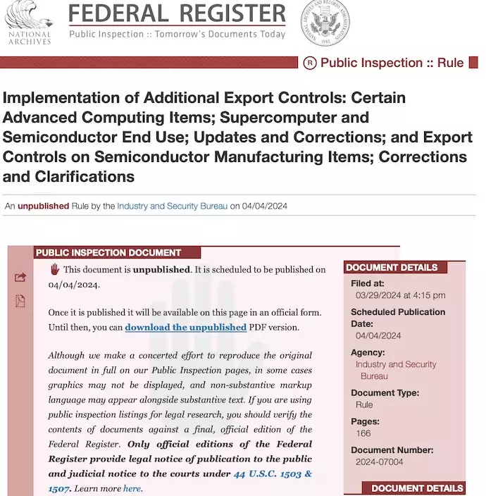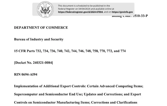 此次BIS公佈的新規,是關於先進計算設備、超級計算機和半導體最終用途的額外出口控制,以及對半導體製造物品的出口控制的修訂和澄清的臨時最終規則。這份文件詳細說明瞭對2023年10月25日公佈的出口控制修訂和「實施額外出口控制:某些先進計算物品;超級計算機和半導體最終用途;更新和澄清」(AC/S IFR))所做的更正和澄清。