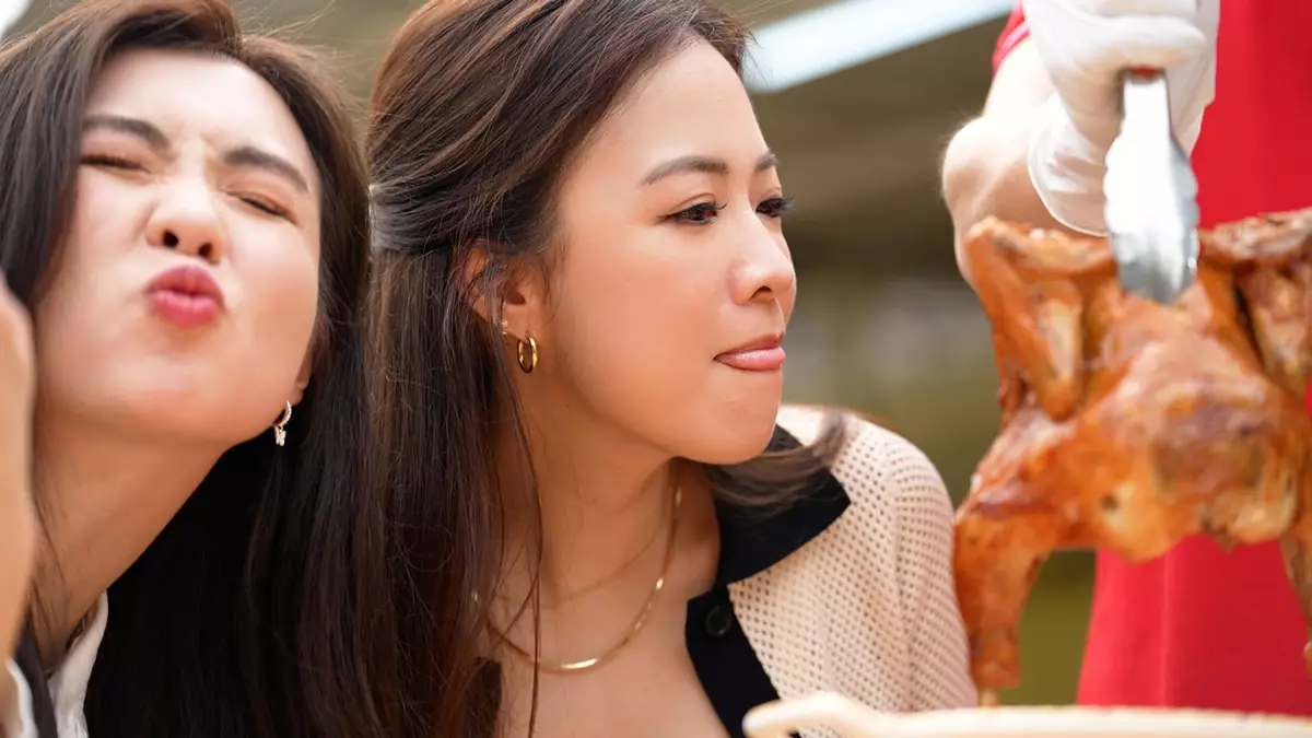 潮汕手切牛肉河粉,食到林秀怡(左)同彭慧中(右)舔舔脷!
