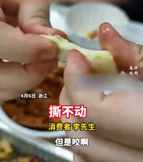 據《大象新聞》報導,來自浙江杭州的李先生日前在「東大方酸菜魚」點了一份酸菜魚的外賣,本以為可以美美享用,但他吃著吃著竟發現有魚片咬不開,感覺有點怪異。李先生表示,「那塊魚片根本咬不動,拿在手上都無法撕開,但這塊魚片的紋路看著和真正的魚肉一模一樣」,於是他馬上向店家反映。對此,店員回答說:「可能是煮久了,你知道魚肉這東西,稍微多煮10秒或20秒就不一樣了」。