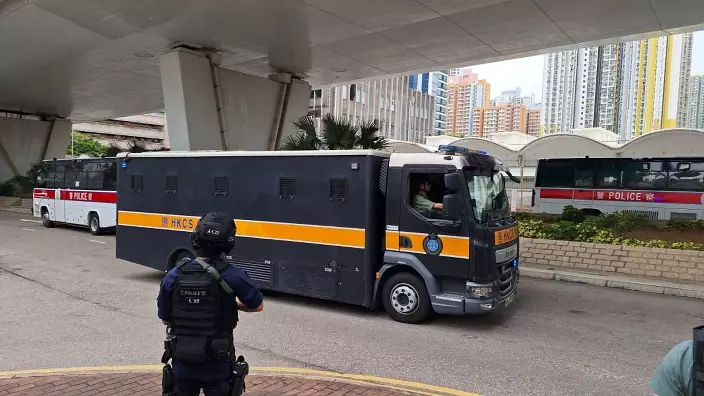 載着黎智英的囚車到庭。 巴士的報記者攝