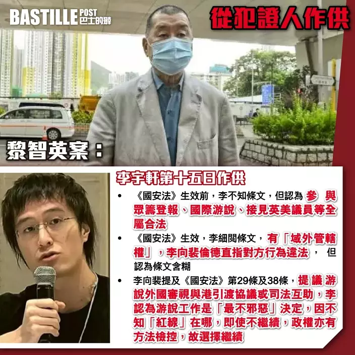 壹傳媒創辦人黎智英與《蘋果日報》3間相關公司涉串謀勾結外國勢力案,4月11日進行第五十八日聆訊。 從犯證人、「十二港人」之一李宇軒第十五日作供稱,在《香港國安法》生效前,他不知道條文內容,但認為自己關於眾籌登報、國際游說等行動,全屬合法;而法例生效後,他細閱條文,向裴倫德表示「他已違法」,但李認為條文內容空泛,覺得「北京會搬龍門」,不知「紅線」在哪裡,故他沒打算停止國際游說行動,並向裴倫德提議游說外國檢視與港引渡協議及司法互助等。