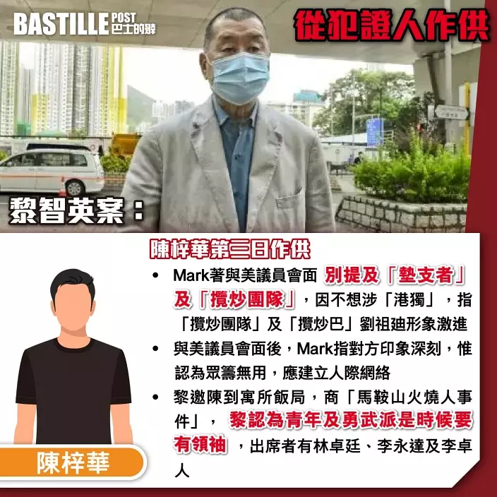 壹傳媒創辦人黎智英與《蘋果日報》3間相關公司涉串謀勾結外國勢力案,4月16日進行第六十一日聆訊。 第五名從犯證人、律師助理陳梓華第三日出庭作供指,Mark Simon曾提及黎可見美國官員,是付款給顧問公司,又得知時任美國參議員Rick Scott於2019年9月訪港,要求陳邀請抗爭「前線」與Rick Scott會面,描述當時香港實際情況,做「民間游說」。陳指當時經歷721及831事件,政治氣氛「好激進」,當時首要已不是五大訴求,市民是尋求對等,並要向國際尋求支援。