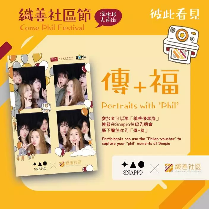 「織善社區節」共分為六大主題區,包括「彼此學習」、「彼此聆聽」、「彼此看見」、「織善文創」、「織善街坊」及「織善客廳」,豐富節目包括攤位遊戲、工作坊、手工創作、互動體驗、展覽、音樂表演等等,公眾可於活動當日即場報名參與。市民只需完成每個主題區的最少一個攤位活動,即可換取「織善優惠劵」享受區內不同小店的優惠,及免費享用Snapio拍照亭等,同時換領價值港幣25元的「織善消費券」,一共4000份。不但可為小店打打氣,更為社區注入熱血和活力,促進社區發展和凝聚力,展現創意與同理心的無限可能。