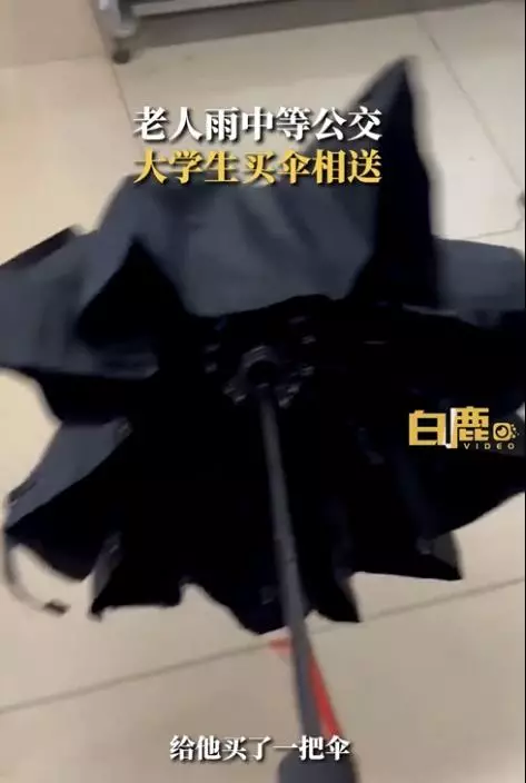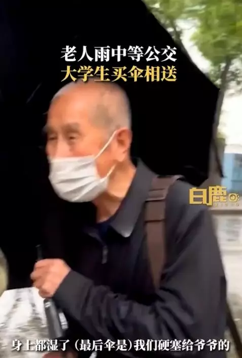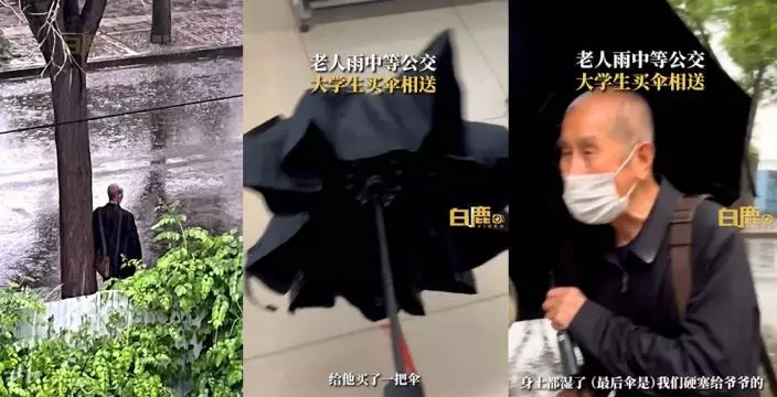 據《白鹿視頻》報導,河北石家莊一名大學生李同學和室友近期看見一名老爺爺正淋著大雨站在樹下等巴士,隨即決定買傘送給對方。