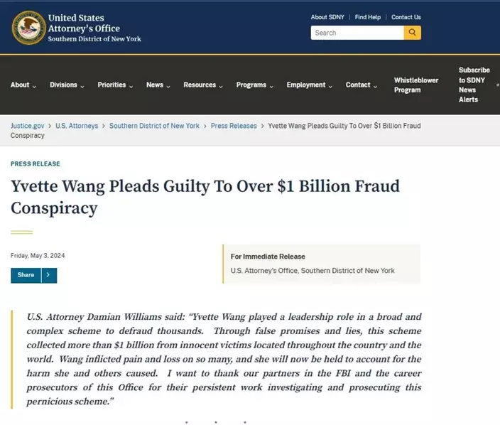 美國紐約南區聯邦檢察官辦公室近日發布消息稱,45歲的紐約居民王雁平(Yvette Wang)認罪,承認合謀參與詐騙和洗錢案。