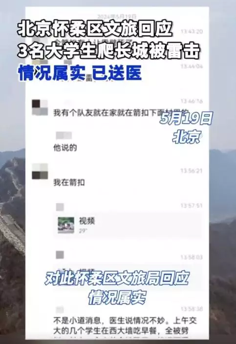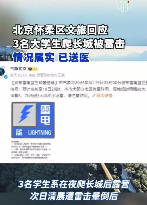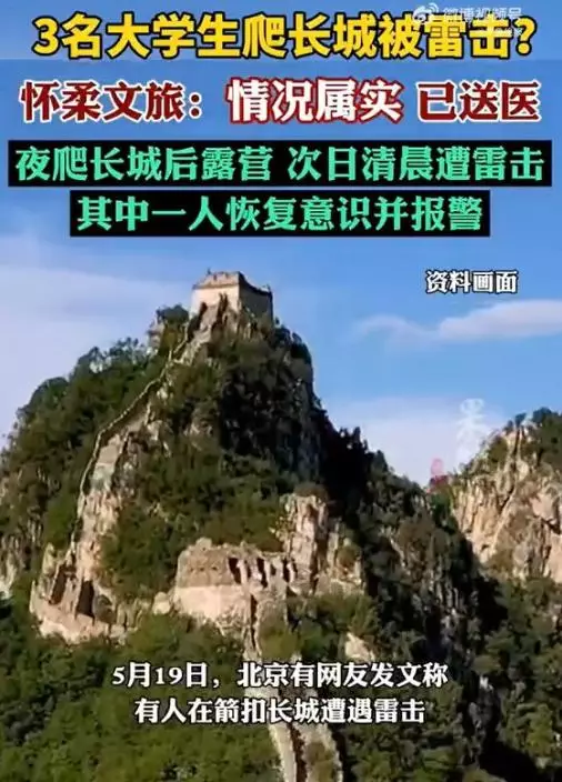 據內媒報導,北京箭扣長城段日前傳出一宗恐怖意外,3名大學生在該處登高時莫名遭遇雷擊,3人當場失去了意識……。3名大學生日前來到北京箭扣長城段遊玩,在晚上他們選擇在長城上露營休息。然而,沒想到在次日清晨,天空突然雷聲轟鳴,3人突然遭受雷擊,當場昏迷不醒。