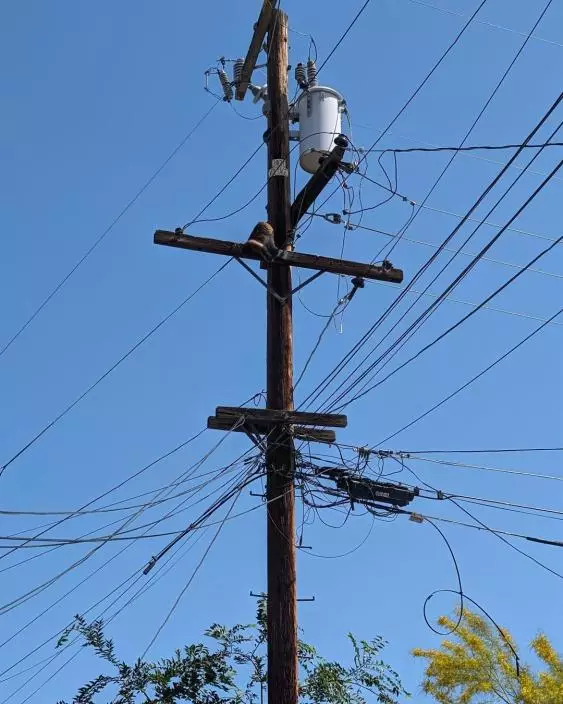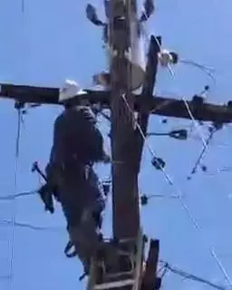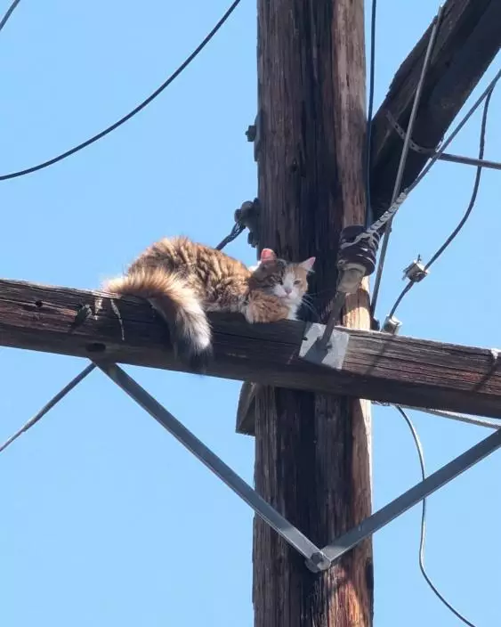 美國加州一隻百厭貓爬上15米高的電線桿,被困數天,沒水沒糧,要由動物救援人員與電力公司合力營救。