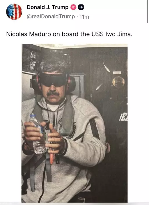 特朗普在其社交平台發佈馬杜羅被生擒後的照片。