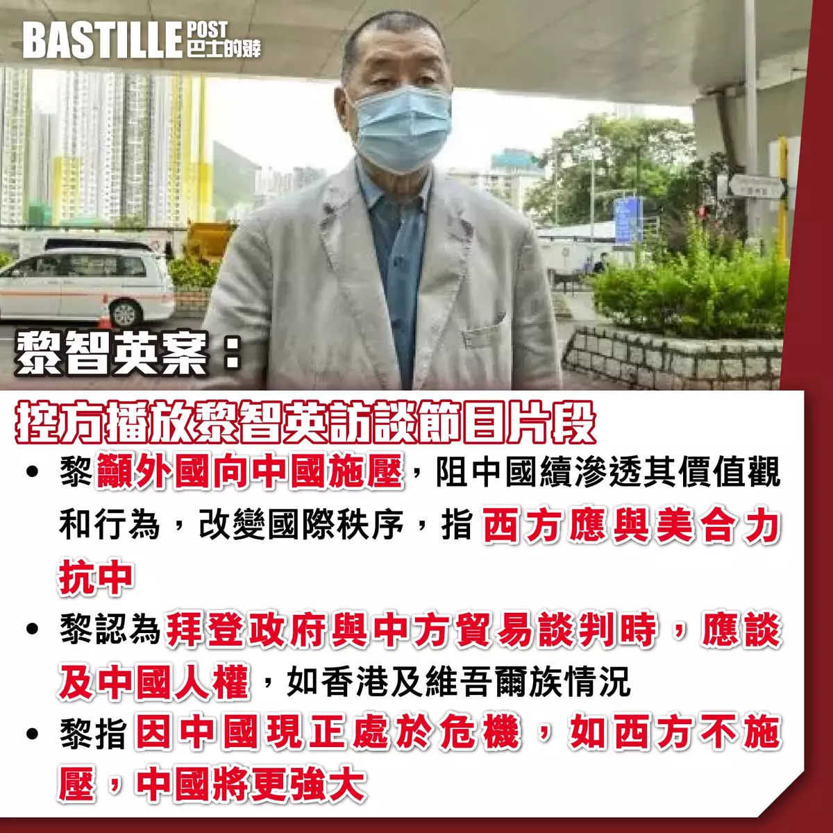 壹傳媒創辦人黎智英與《蘋果日報》3間相關公司涉串謀勾結外國勢力案,第八十五日聆訊下午繼續。控方續在庭上播放黎的直播訪談節目「Live Chat with Jimmy Lai」片段,黎在節目中呼籲外國向中國施壓,阻止中國續滲透其價值觀和行爲,以改變國際秩序規則,否則世界將沒有和平。 黎又認為,美國拜登政府與中方進行貿易談判時,亦應談及中國的人權問題。