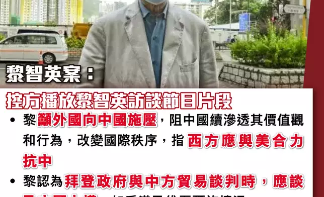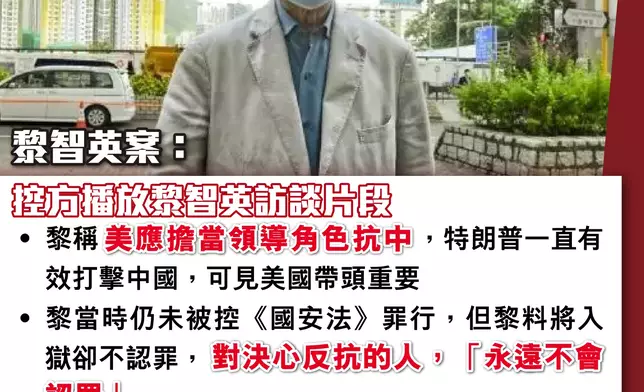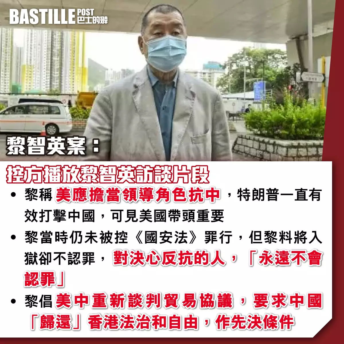 控方播放Fox Business在2020年12月1日的遙距訪問,黎在訪問中指,希望拜登政府重視人權及法治,建議美國與中國重新談判貿易協議,籲拜登政府要求中國「歸還」香港法治和自由,作爲與中國達成任何貿易協議的先決條件。