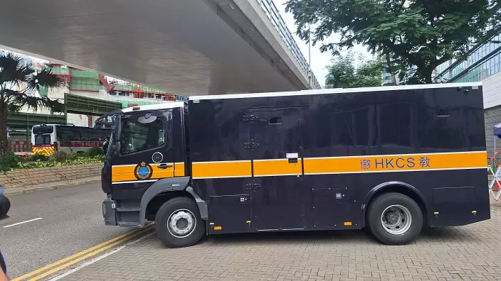 載着黎智英的囚車離開法庭。 (巴士的報記者攝)