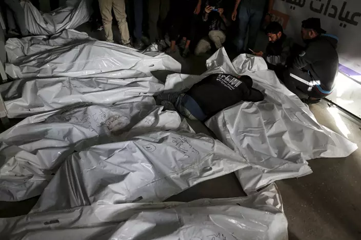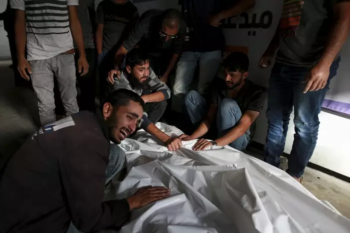 巴勒斯坦民眾在太平間,為以色列空襲中喪生的親戚哀悼。AP圖片