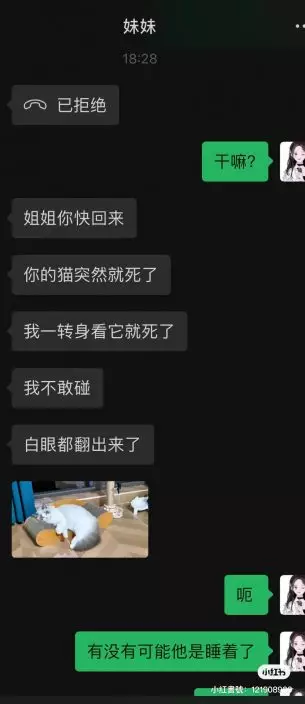 飼主透露,當時妹妹聲音慌張,正當她想進一步詢問Kimi的情況時,妹妹就傳來了Kimi躺在貓抓板上的照片,妹妹稱貓貓一動不動而且還翻著白眼,「突然就死了」。
