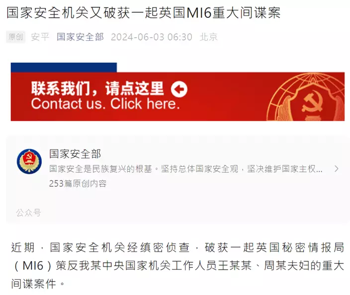 6月3日,據國家安全部微信公眾號披露,近期,國家安全機關經縝密偵查,破獲一起英國秘密情報局(通稱軍情六處或MI6)策反我某中央國家機關工作人員王某某、周某夫婦的重大間諜案件。