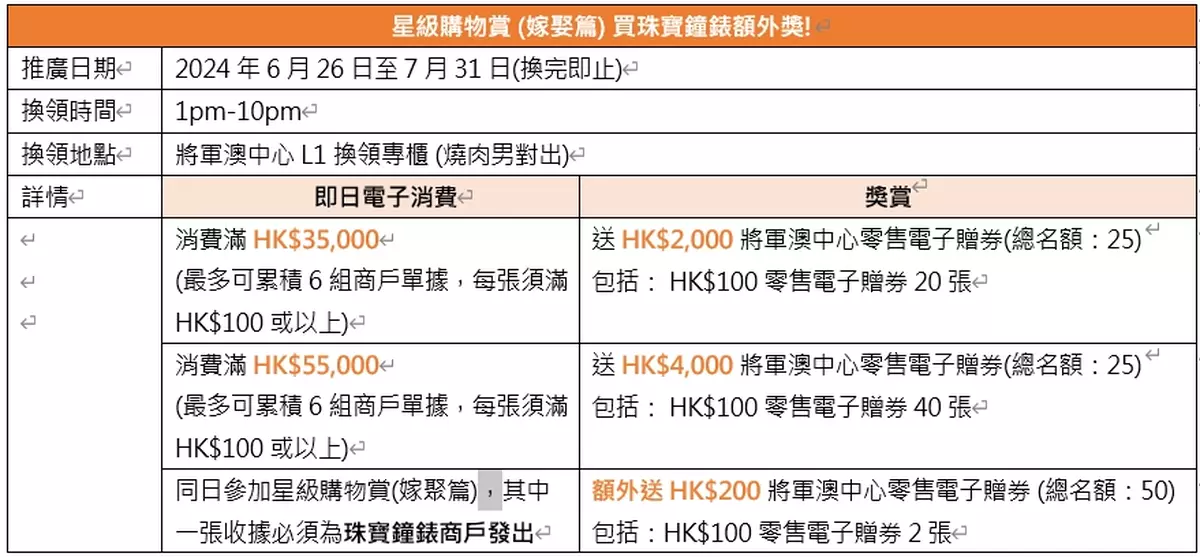 【星級購物賞(嫁娶篇)】:The Point會員更可專享「星級購物賞」消費優惠,由6月26日起以電子貨幣於將軍澳中心、PopDeli 或PopFood消費滿HK$35,000 或HK$55,000,即可獲HK$2,000及HK$4,000零售電子贈券兼同時賺取積分;同日參加【星級購物賞(嫁娶篇)】, 其中一張收據必須為珠寶鐘錶商戶發出, 即額外送HK$200零售電子贈券,讓你逃選新人新婚禮物同時更著數!