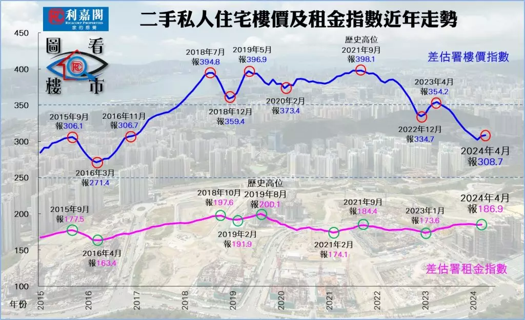 撤辣初期激起購買力及樓價,惟在新盤低價搶去大量購買力下,二手樓價轉趨受壓,甚或在缺乏其他利好因素支撐下,恐再走下坡。差估署公布的最新數據顯示,2024年4月份私人住宅售價指數報308.7點,較3月的307.8點再升0.29%,連漲兩個月,惟漲幅有所收窄,樓價已連續兩個月創下今年以來的新高,但首4個月累計,仍跌0.84%;若與2021年9月的歷史高位398.1點比較,樓價累積跌幅持續收窄至22.46%。