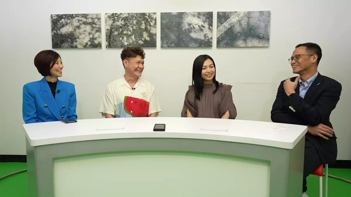 香港電台第二台節目總監程潔瑩(右二)以及香港電台第二台節目主持李志剛(左二),接受巴士的報社長盧永雄(右一)以及總編輯李彤(左一)訪問(巴士的報記者攝)
