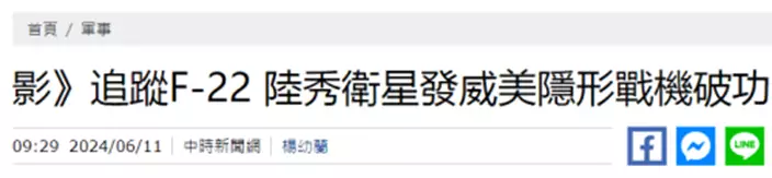台灣中時新聞網11日稱,社交平台X的「衝突報告」稱,中國商業遙感衛星公司「長光衛星技術」在2020年發布的一段6秒短視頻顯示,該公司的商用遙感衛星吉林一號追踪美國F-22隱形戰鬥機機的實况,清晰地顯示了F-22穿過雲層飛行,而衛星却完全不為所動,牢牢地鎖定了這架隱形戰鬥機。
