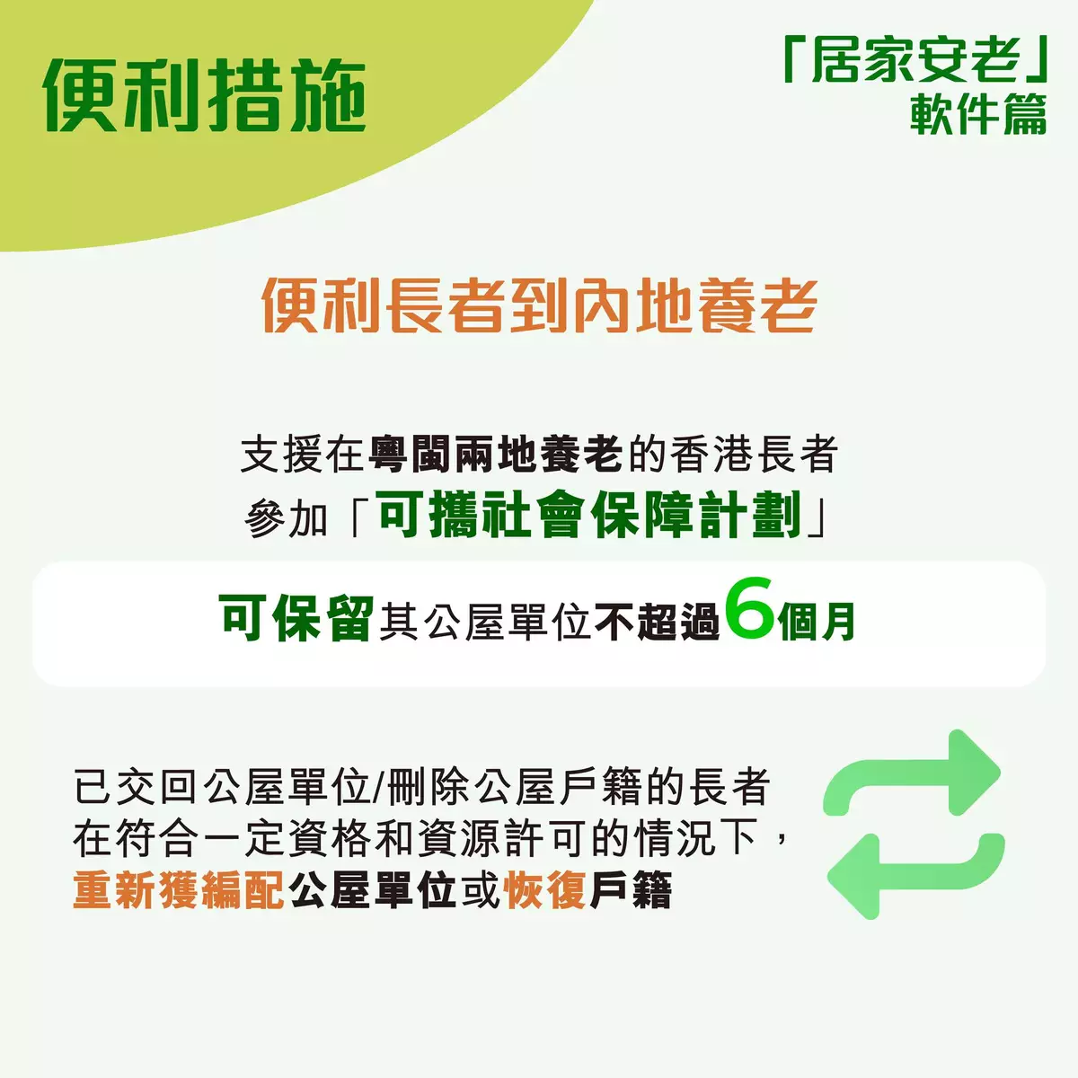 有見一些長者選擇到內地養老,但又怕適應不了或需回港,房屋署支援參加「可攜社會保障計劃」、在粵閩兩地養老的香港長者,可保留其公屋單位不超過6個月。已交回公屋單位或刪除公屋戶籍的長者,在符合一定資格和資源許可下,可重新獲編配公屋單位或恢復戶籍。