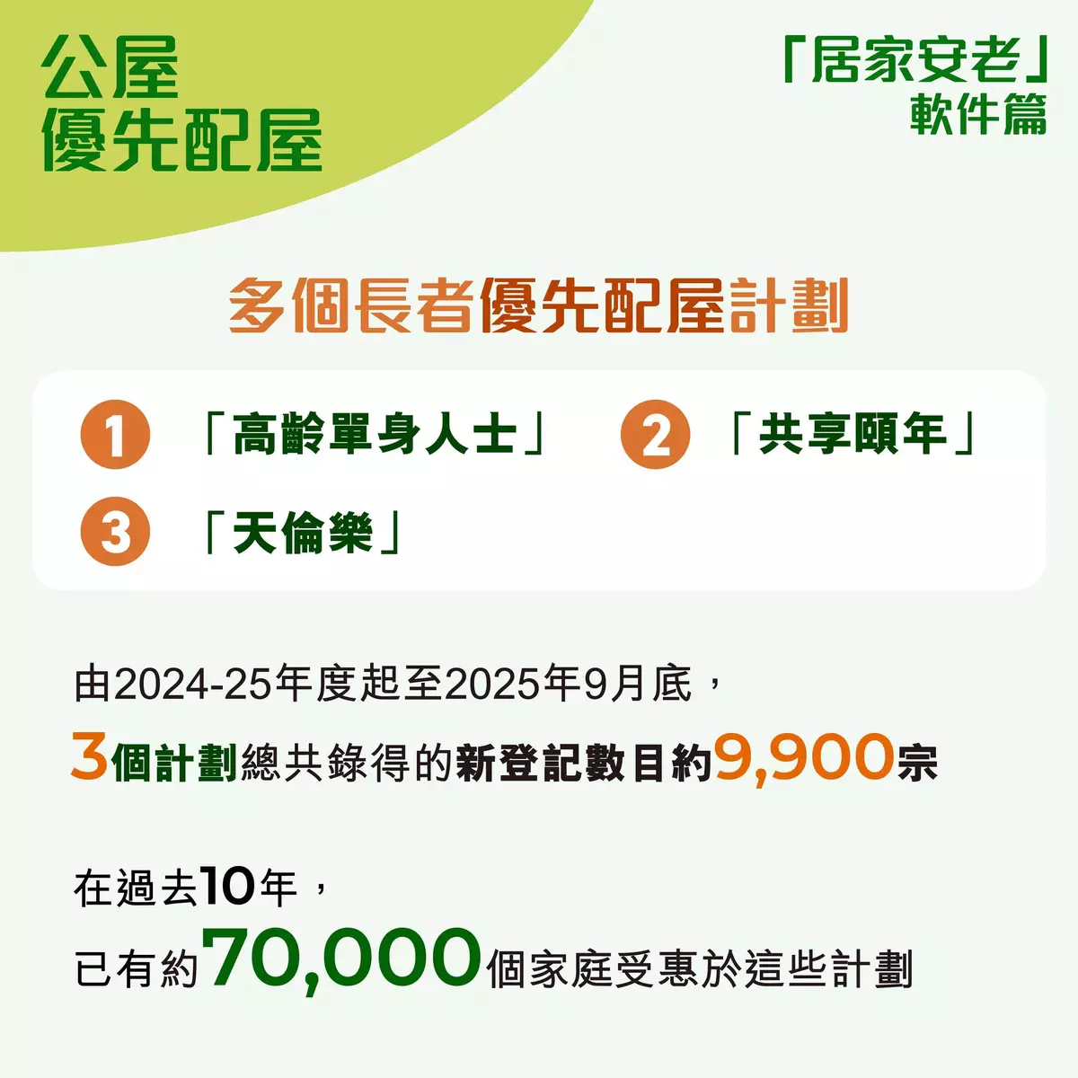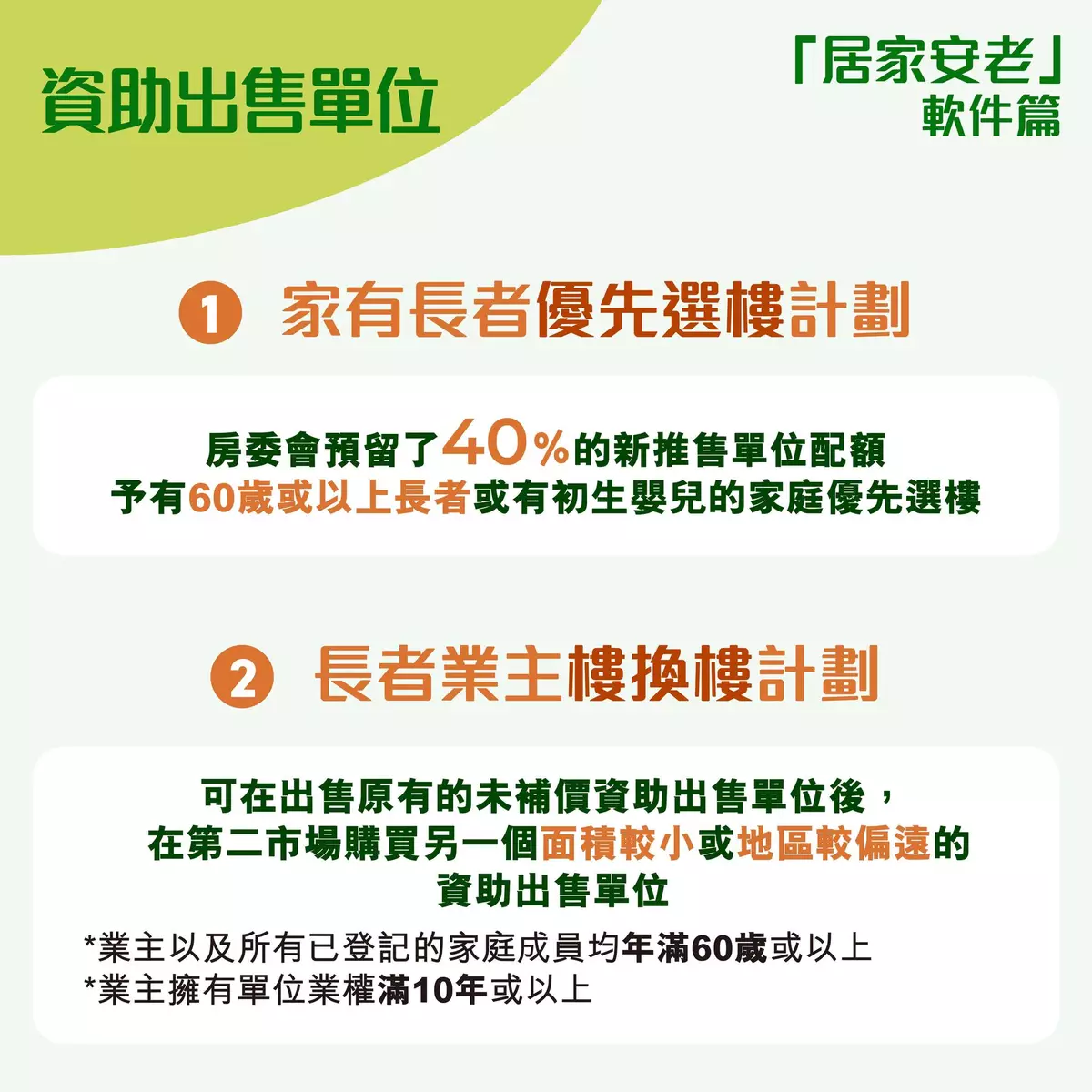 此外,房屋署在資助出售單位方面,也有「家有長者優先選樓計劃」及「長者業主樓換樓計劃」,讓長者或有長者的家庭有更多機會選擇合適居所。
