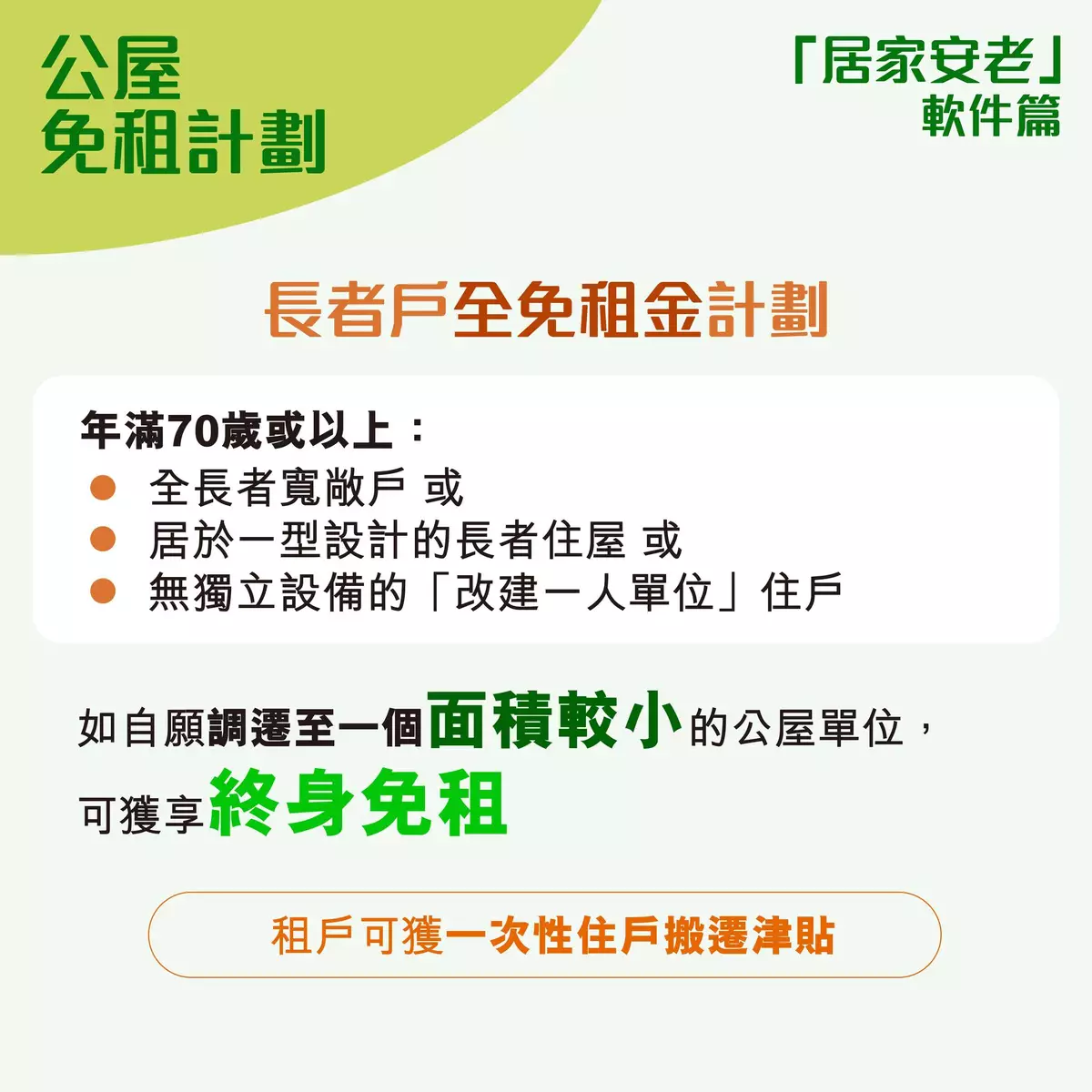 在政策上,房屋署有「高齡單身人士」優先配屋計劃、「共享頤年」優先配屋計劃及「天倫樂」優先配屋計劃,過去10年已有約70000個家庭受惠於這些計劃。年滿70歲或以上的長者,包括全長者寬敞戶、居於一型設計的長者住屋或無獨立設備的「改建一人單位」住戶,如自願調遷至一個面積較小的公屋單位,可獲終身免租。