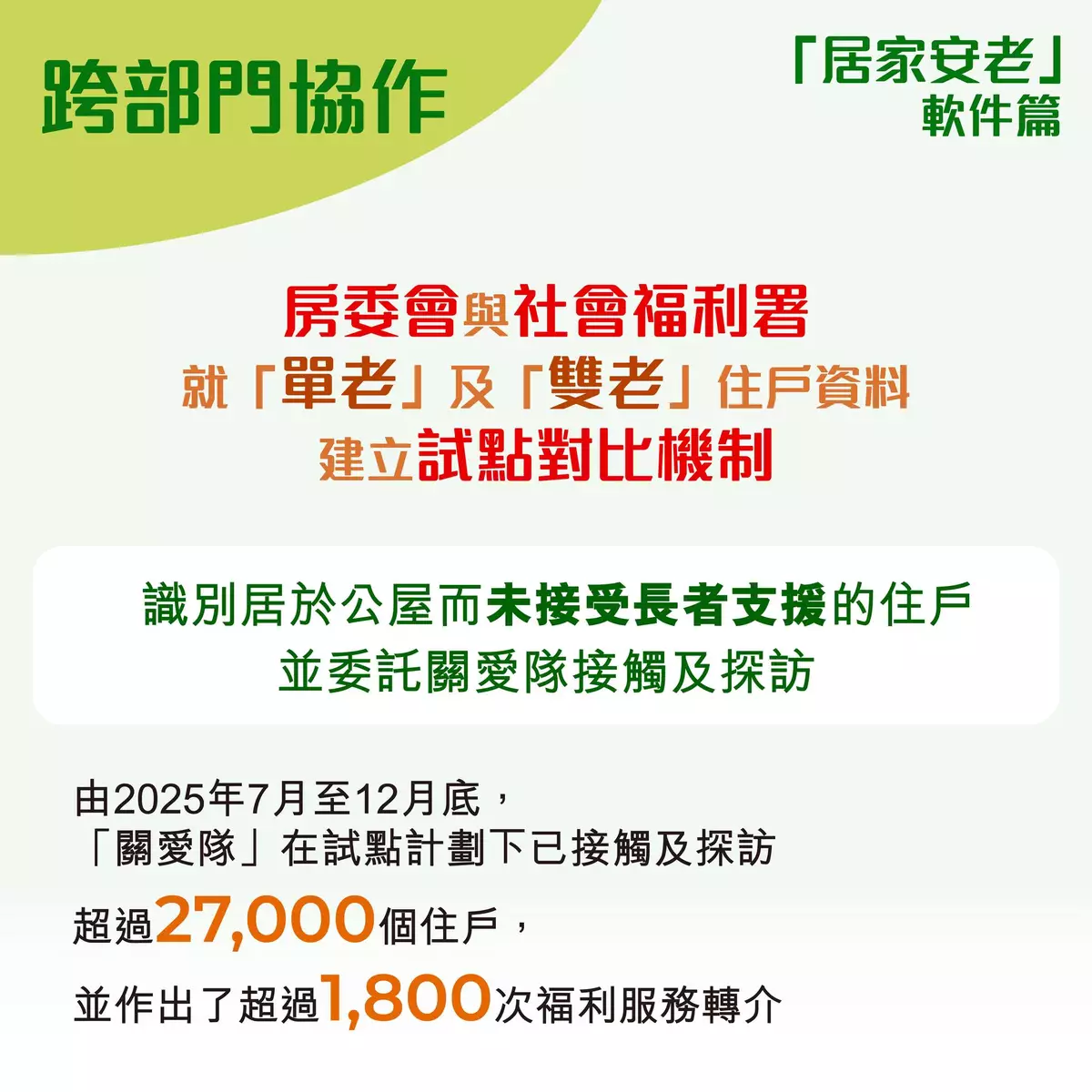 何永賢表示,房屋署注重長者得到的實際關心與支援,除了屋邨管理人員會主動上門探訪,房委會還與社會福利署就「單老」及「雙老」住戶資料建立試點對比機制,由去年7月至12月底,「關愛隊」在試點計劃下已接觸及探訪超過27000個住戶,並作出了逾1800次福利服務轉介。