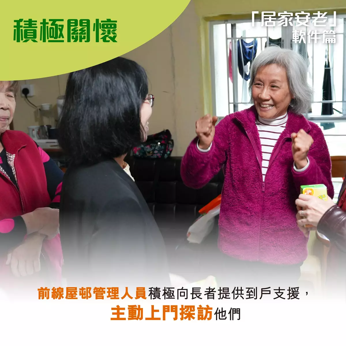 房屋署本年度的「邨『友』好事」將支援長者納入為重點項目,積極與不同政府部門及機構合作,例如與衞生署合作於60個屋邨推展「我好叻」健康推廣計劃,鼓勵長者培養健康生活習慣等。